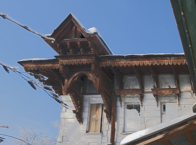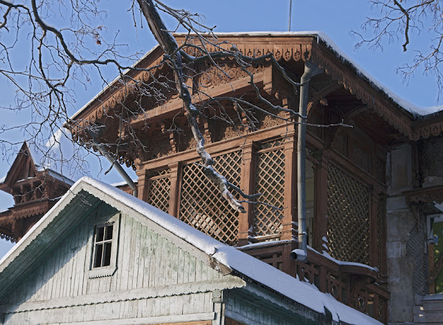Деревянные резные карнизы крыши здания выполнены в русском стиле. |